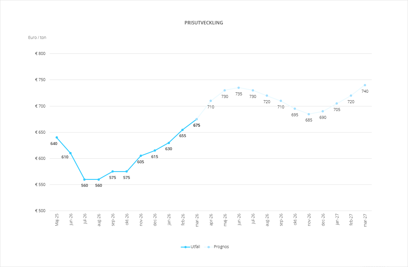 Om vi tittar på utvecklingen för varmformade coilpriser enligt MEPS – det vanligaste indexet för bandprodukter – ligger dagens nivå kring 675 EUR/t, vilket motsvarar en ökning på drygt 100 EUR/t, alltså cirka 20%, jämfört med för ett halvår sedan. Prognosen pekar på flera höjningar under andra kvartalet, med en möjlig topp under sommaren på ytterligare cirka 60 EUR/t från dagens nivå. Givet den osäkerhet som råder får tiden utvisa utfallet, men med ett tydligt pristryck uppåt och ökade kostnader för produktion och transport framstår det som sannolikt att utvecklingen följer grafens riktning.